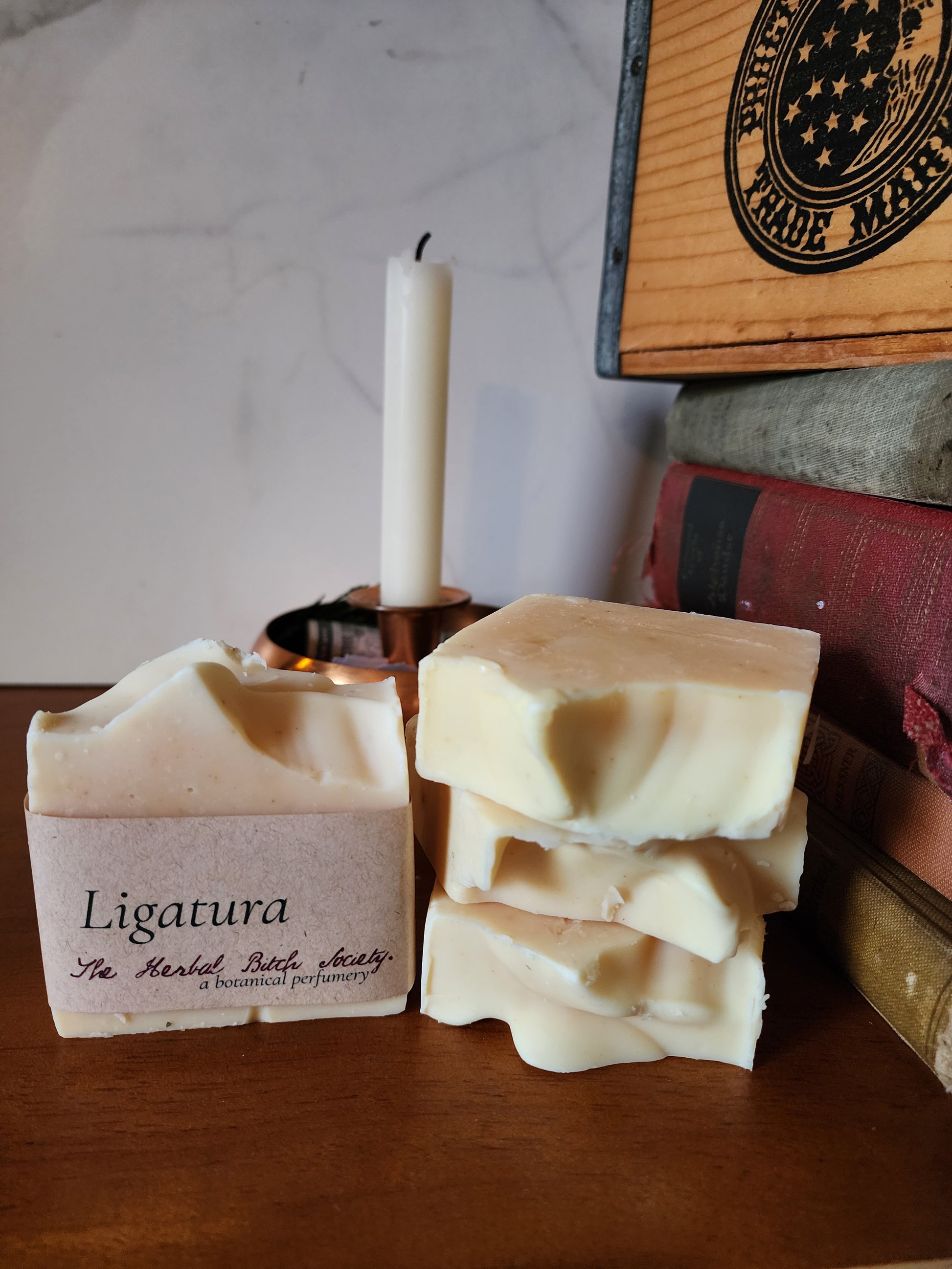 Ligatura is a word that means tying or binding. Like its name, this soap is magic. It's scent is beautifully fresh and clean, with a hint of warm wood from the vetiver.