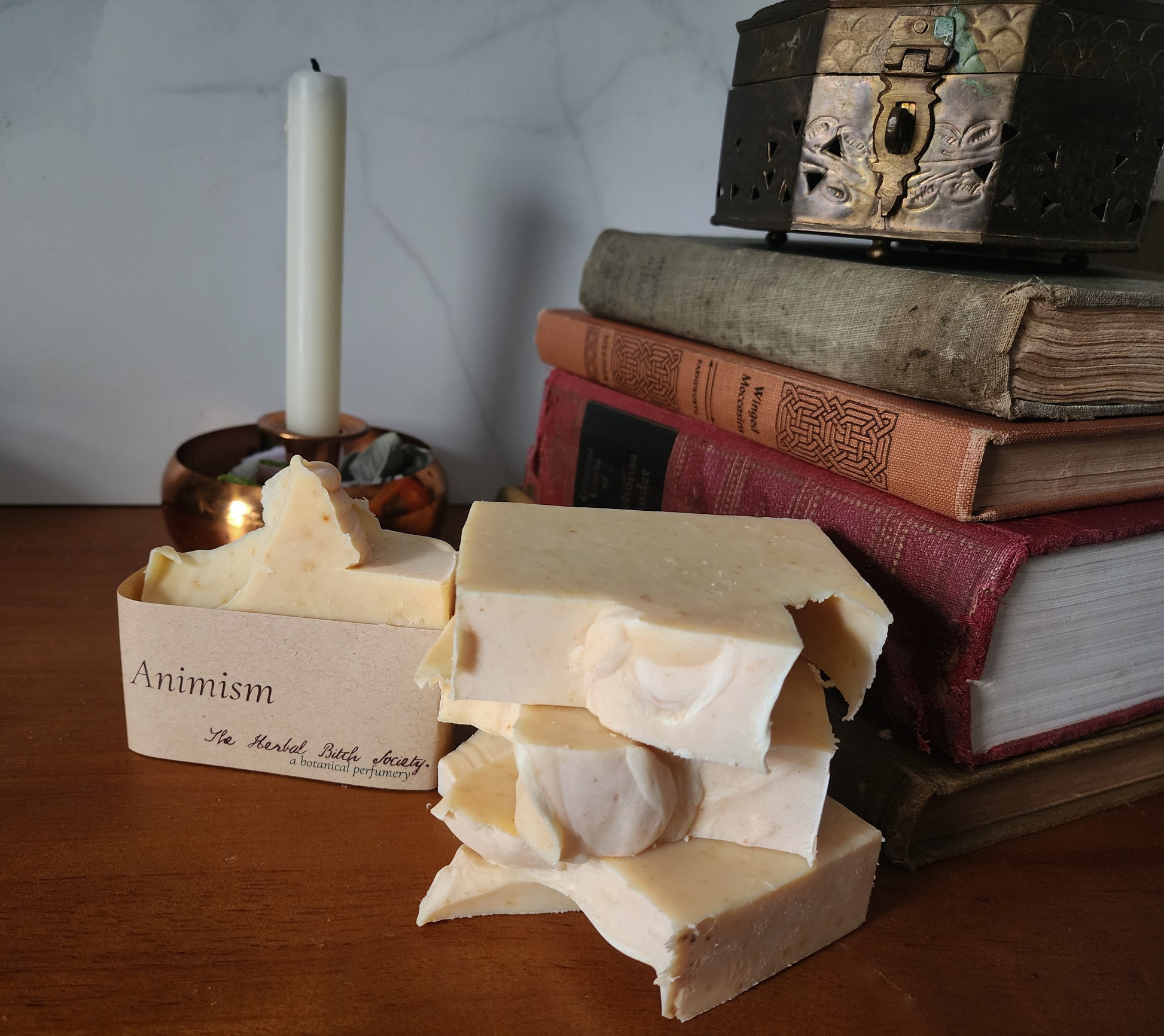 This soap's name has to do with the idea that inanimate objects have a soul or an energy. This soap is made with a blend of vegan butters, and is coconut-free. It's scent is bright yet clean with a heavy presence of tea tree essential oil, a moderate amount of lemongrass essential oil, and a touch of ylang ylang essential oil. Use this soap for body or hand washing.